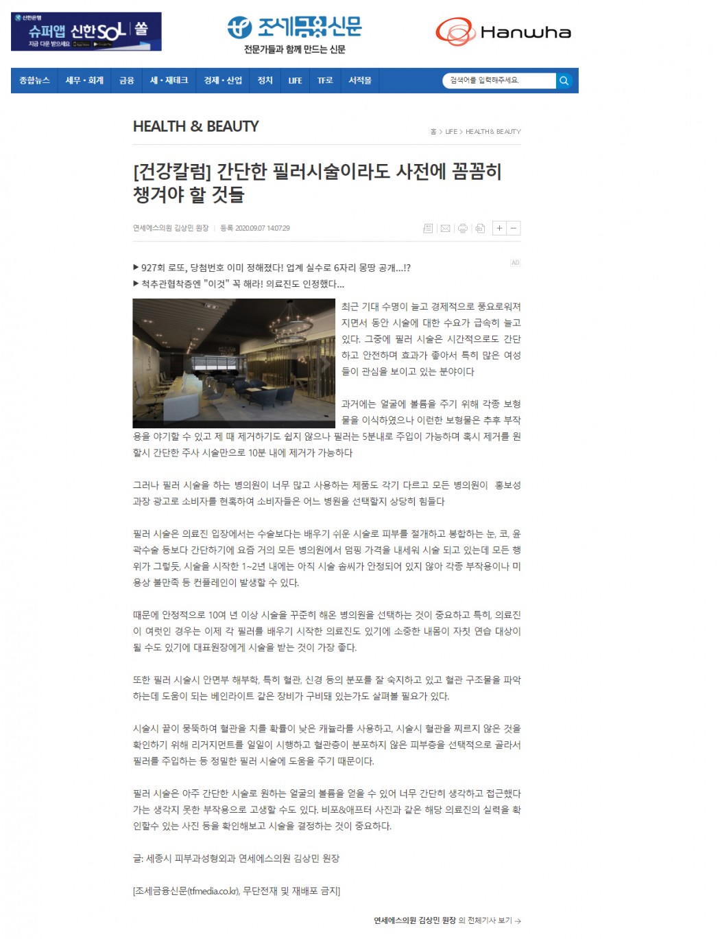 인쇄하기/글자확대.축소 기본 크게 더크게 인쇄 스크랩 목록보기 [건강칼럼] 간단한 필러시술이라도 사전에 꼼꼼히 챙겨야 할 것들 페이지 정보 작성자연세S클리닉 작성일2020-09-07 19:20:28 조회3,469 댓글0 본문 인쇄하기/글자확대.축소 기본 크게 더크게 인쇄 스크랩 목록보기 이전글 ▲피부질환 대표선수 기미, 여드름 정확한 원인 파악과 맞춤형 치료가 중요 다음글 ▼기미,잡티 등 피부과 시술, 최첨단 레이저보다 의료진 경험이 더 중요 댓글목록 등록된 댓글이 없습니다. 이전글 다음글 목록보기