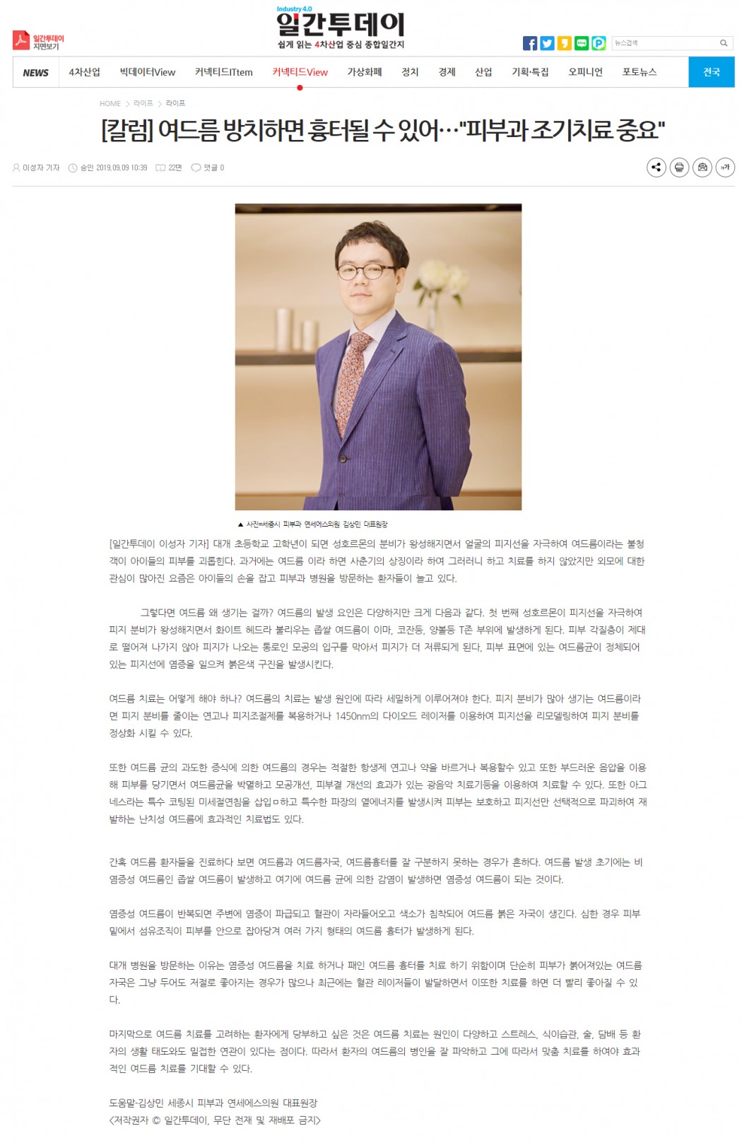 인쇄하기/글자확대.축소 기본 크게 더크게 인쇄 스크랩 목록보기 [칼럼] 여드름 방치하면 흉터될 수 있어 "피부과 조기치료 중요" 페이지 정보 작성자연세S클리닉 작성일2019-09-09 12:31:50 조회3,134 댓글0 본문 인쇄하기/글자확대.축소 기본 크게 더크게 인쇄 스크랩 목록보기 이전글 ▲[건강칼럼] 환절기 피부 트러블, 기미, 여드름 '맞춤케어'로 철저한 관리 다음글 ▼[칼럼] 피부과 보톡스 필러, 믿을 수 있는 병원 선택이 중요 댓글목록 등록된 댓글이 없습니다. 이전글 다음글 목록보기