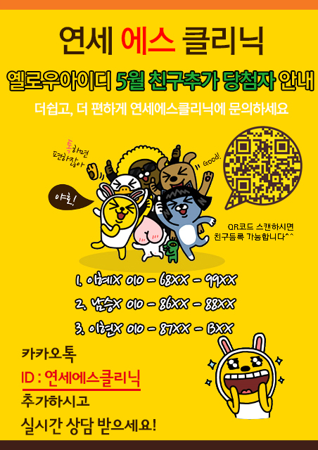 인쇄하기/글자확대.축소 기본 크게 더크게 인쇄 스크랩 목록보기 연세에스의원 5월 옐로우아이디 친구추가 당첨자 안내 페이지 정보 작성자연세S클리닉 작성일2016-05-20 16:12:00 조회3,622 댓글0 본문 인쇄하기/글자확대.축소 기본 크게 더크게 인쇄 스크랩 목록보기 이전글 ▲2016년 6월 옐로우아이디 당첨자 안내!! 다음글 ▼연세에스의원 2016년 소비자만족지수 1위 수상 댓글목록 등록된 댓글이 없습니다. 이전글 다음글 목록보기