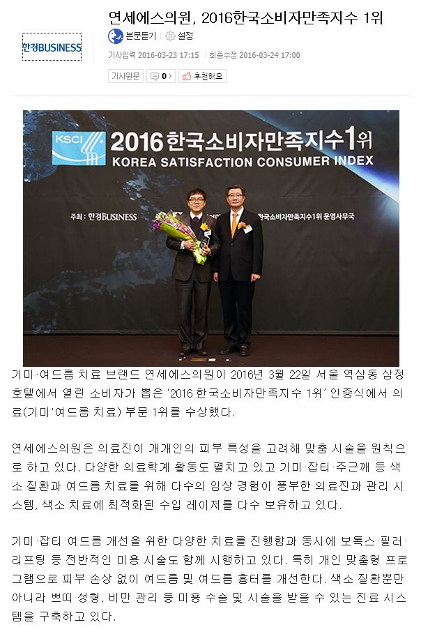 인쇄하기/글자확대.축소 기본 크게 더크게 인쇄 스크랩 목록보기 한경BUSINESS 연세에스의원, 2016한국소비자만족지수 1위 페이지 정보 작성자연세S클리닉 작성일2016-07-07 18:36:43 조회3,498 댓글0 본문 인쇄하기/글자확대.축소 기본 크게 더크게 인쇄 스크랩 목록보기 이전글 ▲[기자탐방] 김상민 원장이 말하는 기미, 여드름 피부관리법 다음글 ▼2016년 6월 옐로우아이디 당첨자 안내!! 댓글목록 등록된 댓글이 없습니다. 이전글 다음글 목록보기